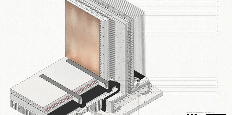 The locations of the following envelope details (A, B, C and D) are extracted from the isometric 1.100 envelope of the restaurant complex within the project.